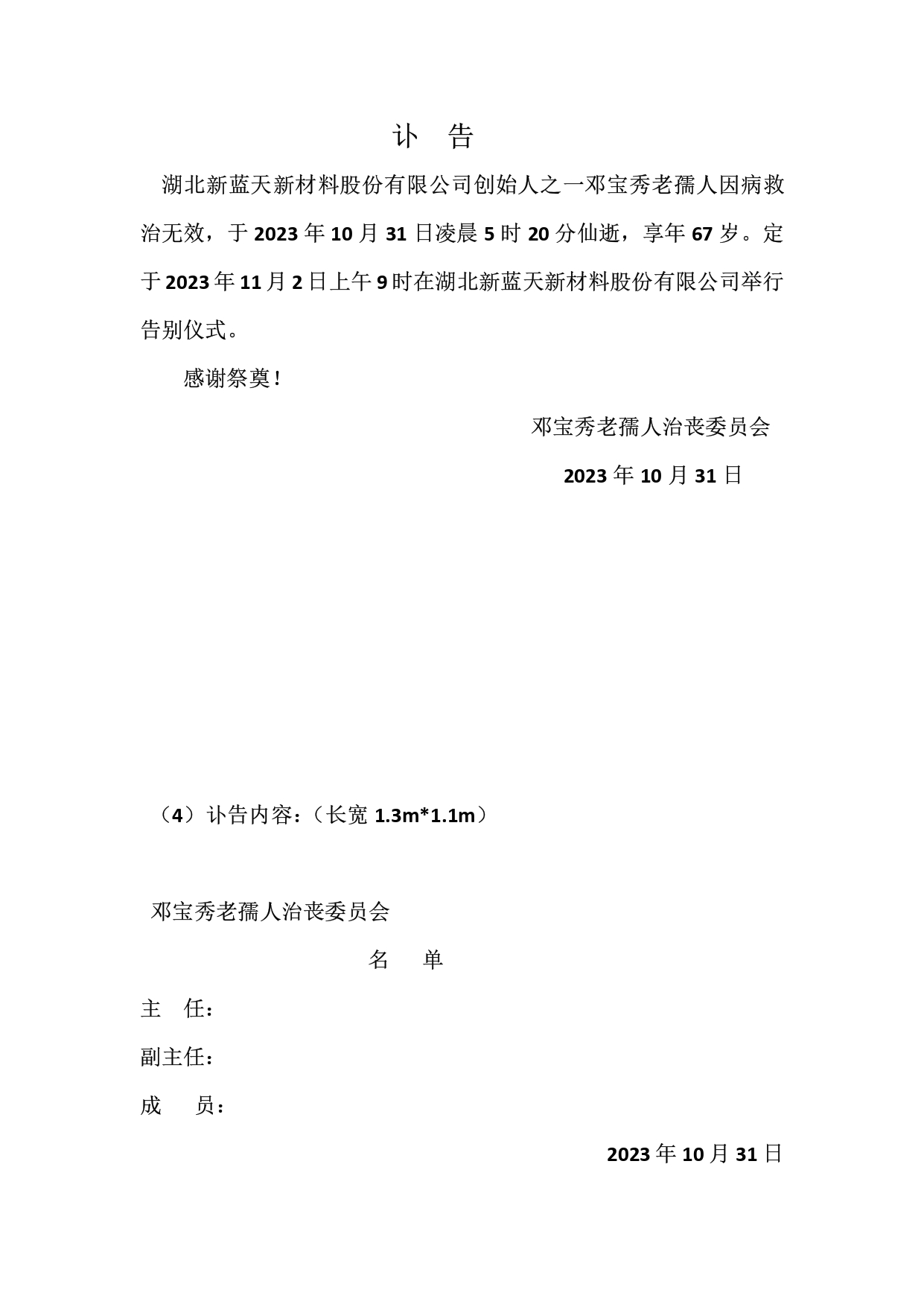 湖北新藍天新材料股份有限公司創(chuàng)始人之一鄧寶秀老孺人因病救治無效,于2023年10月31日凌晨5時20分仙逝,享年67歲。定于2023年11月2日上午9時在湖北新藍天新材料股份有限公司舉行告別儀式。...
